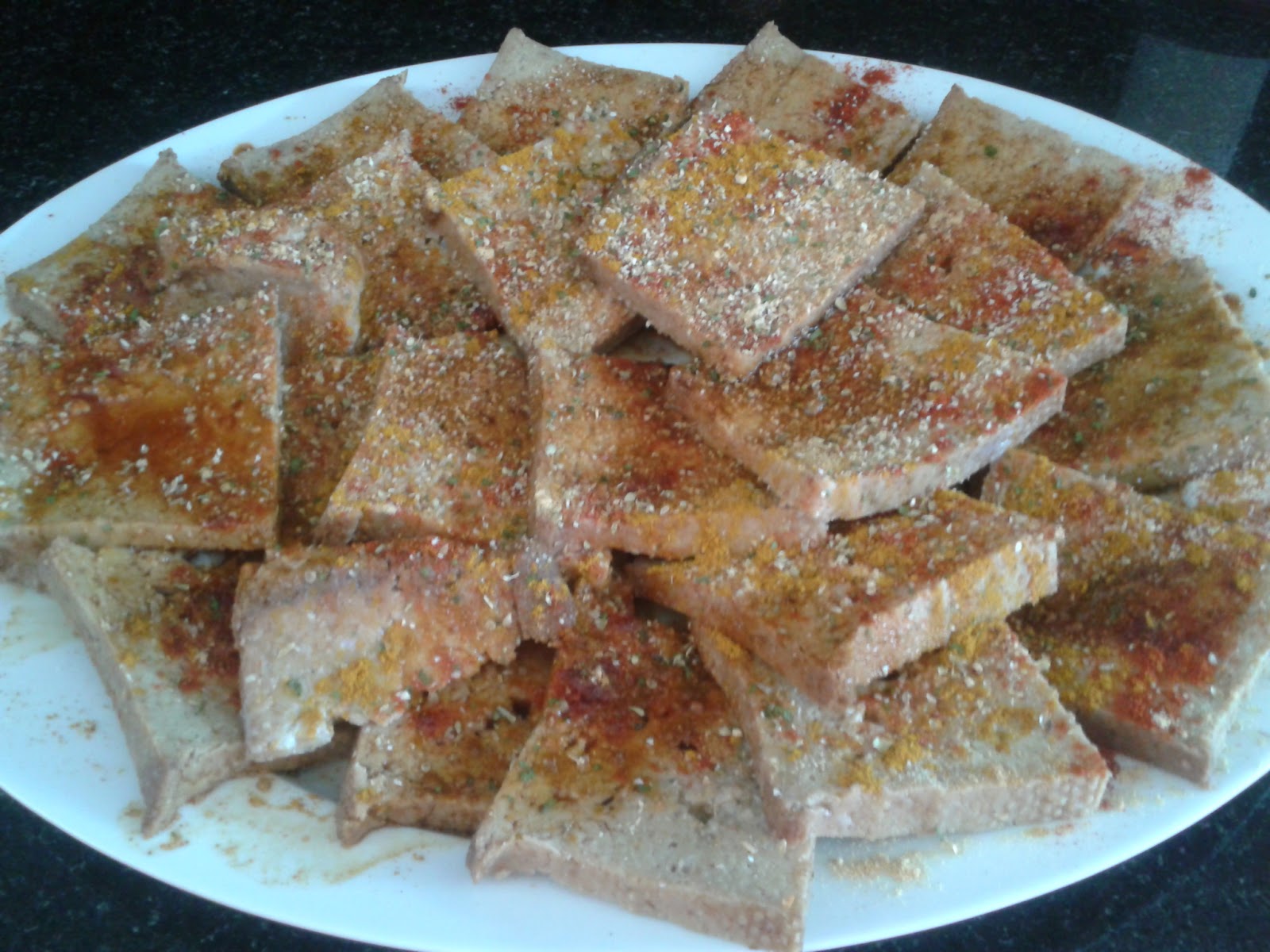 2. Dispor as fatias num recipiente grande de forma a que todas fiquem bem temperadas (usei uma travessa)