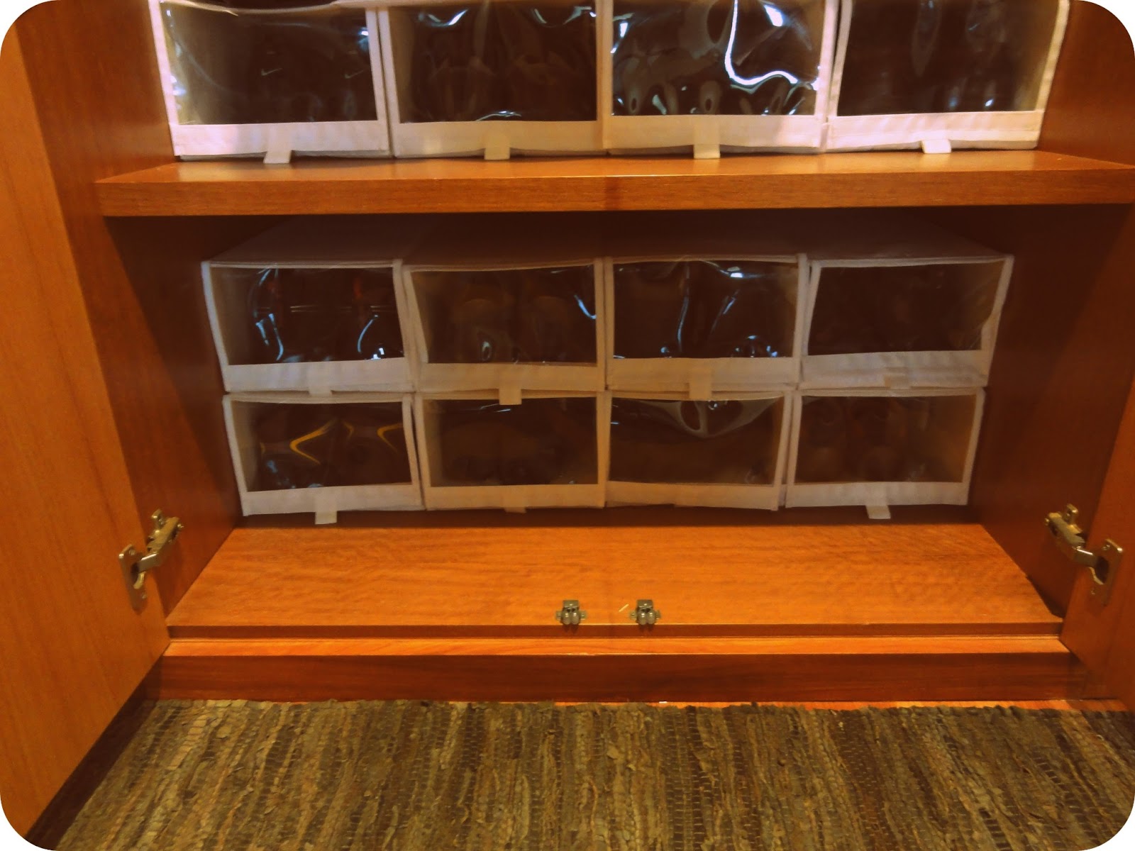 O calçado está todo arrumado nestas caixas e à frente das caixas há espaço suficiente para colocar calçado que não queremos logo arrumar ou até o meu (que depois arrumo no quarto, tal como disse aqui).
