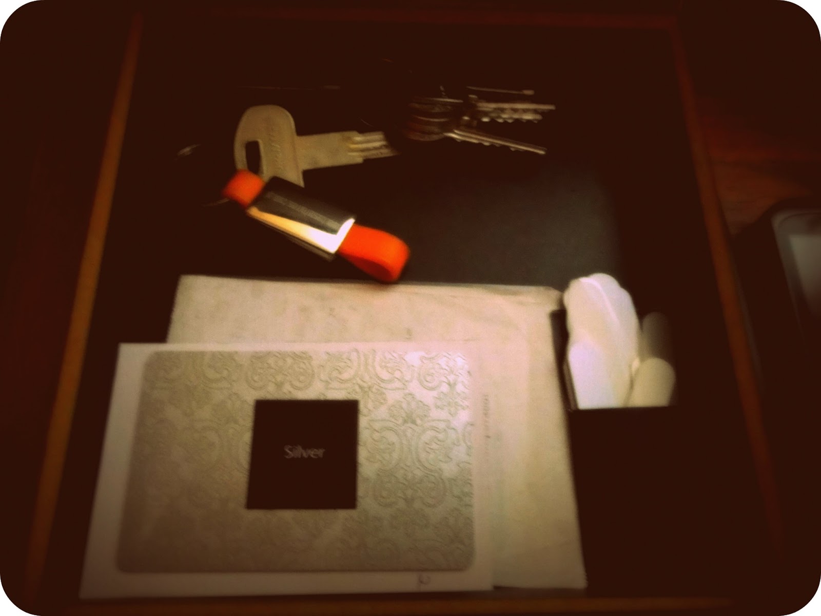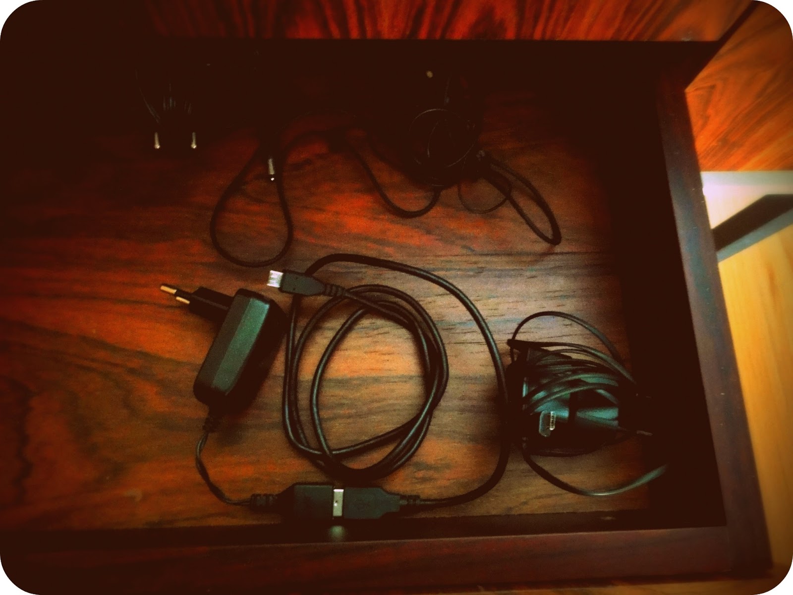 O móvel tem 3 gavetas: uma grande com os óculos e relógios do marido (pois assim estão sempre à mão) e duas pequeninas, uma onde estão todos os carregadores, phones… e outra para colocar chaves, porta-moedas e cartões menos usados. Em vez de andarmos com os cartões todos na carteira (isto já depois de termos feito uma arrumação e de termos deitado vários ao lixo), aqueles que raramente são usados ficam nesta gaveta (numa caixa preta de velas e incenso que aproveitei), assim quando se tiver que ir a determinado sítio é só pegar neles.