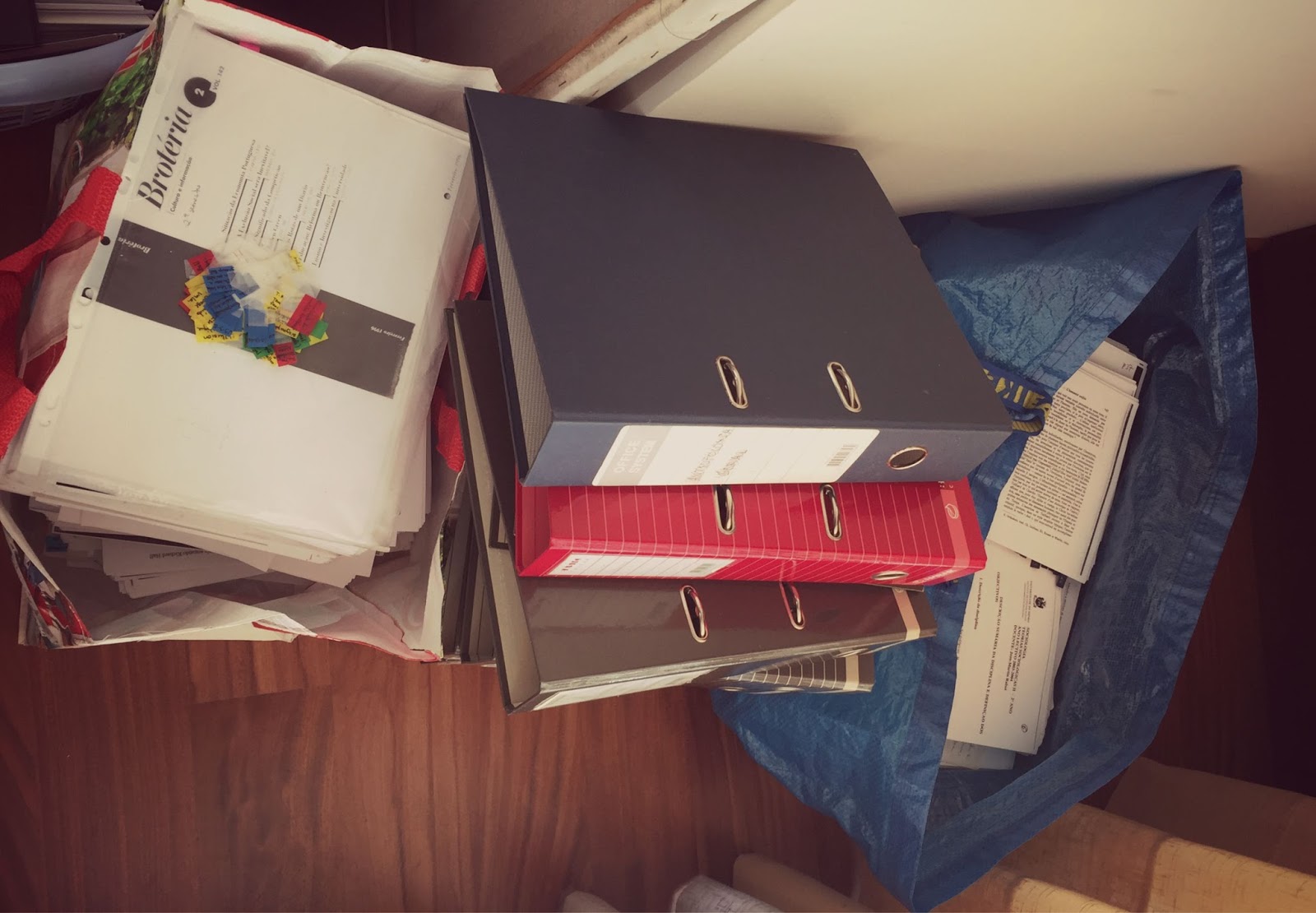 O destralhanço ainda passou pela casa dos meus pais, livrei-me de todas as capas e fotocópias que fui juntando ao longo do curso. Há que ser realista e pensar friamente: não vou precisar mais disto!