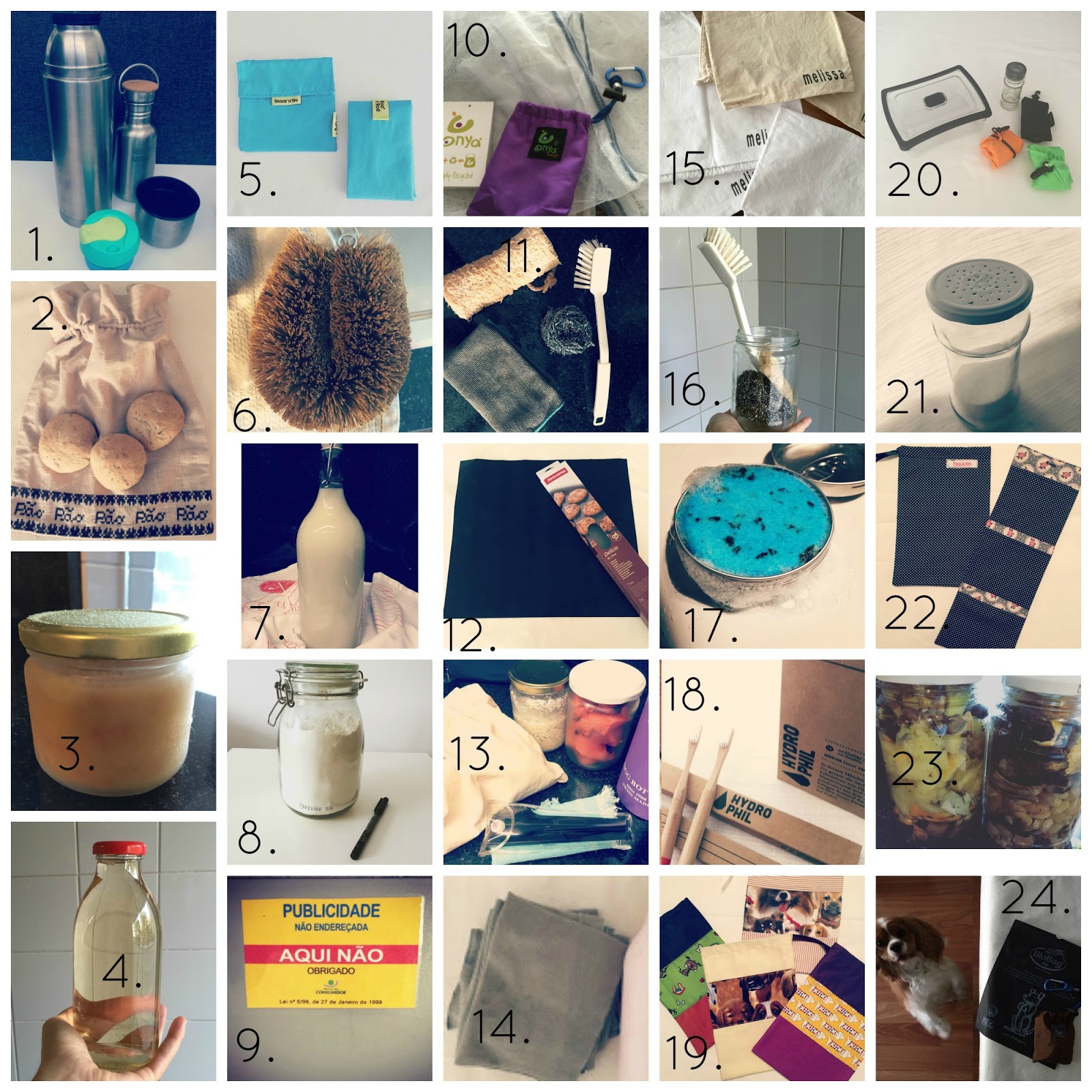 24 – Sacos biodegradáveis para apanhar o cocó de cão (no outono e inverno apanho com folhas, daquelas mesmo grandes, o meu cão é pequeno e por isso dá jeito, coloco directamente no lixo), sempre que não tenho folhas à mão uso estes sacos. Comprei na Ecoescolhas.