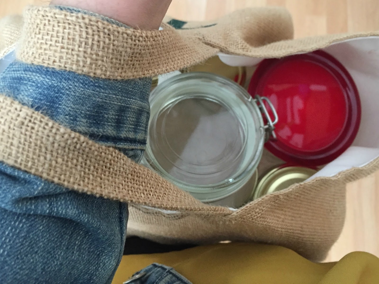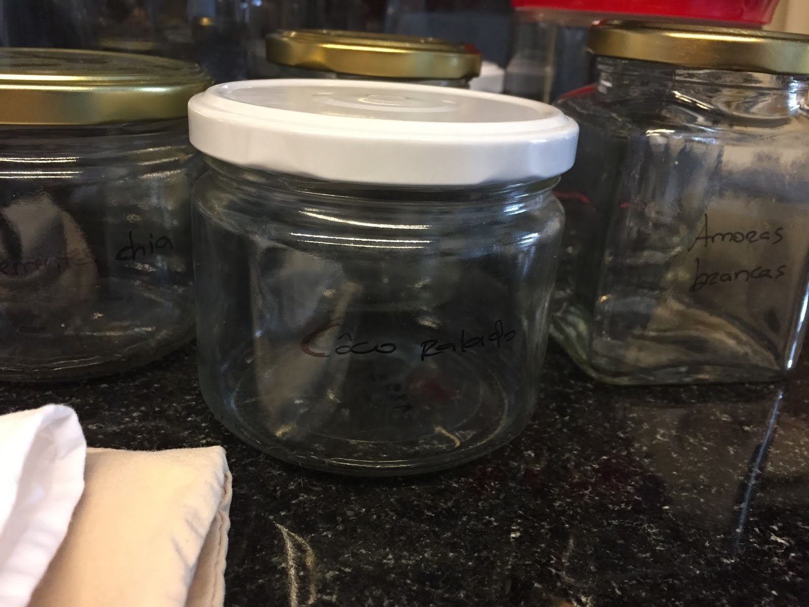 Registei o peso na parte de baixo de cada frasco e à frente escrevi o ingrediente que queria trazer em cada um. Assim, é uma forma bem mais simples de fazer a lista e também já não tenho que o fazer quando chego a casa. Claro que o senão é mesmo o vidro ser mais pesado do que os sacos em tecido.
