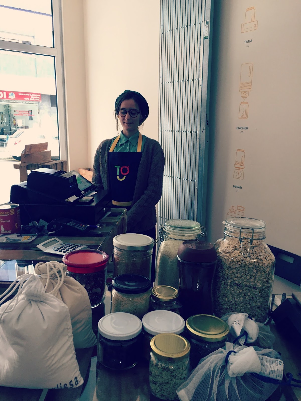Então voltando à toca, fui recebida com imensa simpatia. Comecei por perguntar como funcionava (peso dos frascos/como me poderia servir…), pois em alguns sítios retira-se o peso do frasco no final (já na caixa), enquanto noutros temos primeiro que retirar a tara (ou seja pesar os nossos frascos vazios).