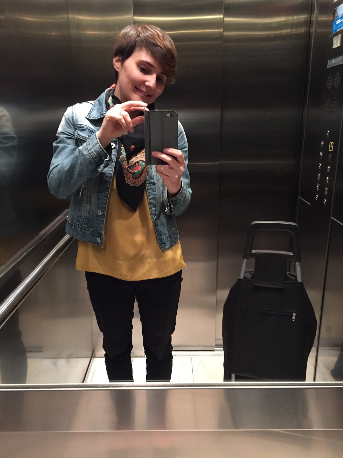 Ainda tirei a foto da praxe no elevador. Estou com uma blusa que era de uma amiga e o lenço era da minha mãe (acho que já deve ter mais anos do que eu!).