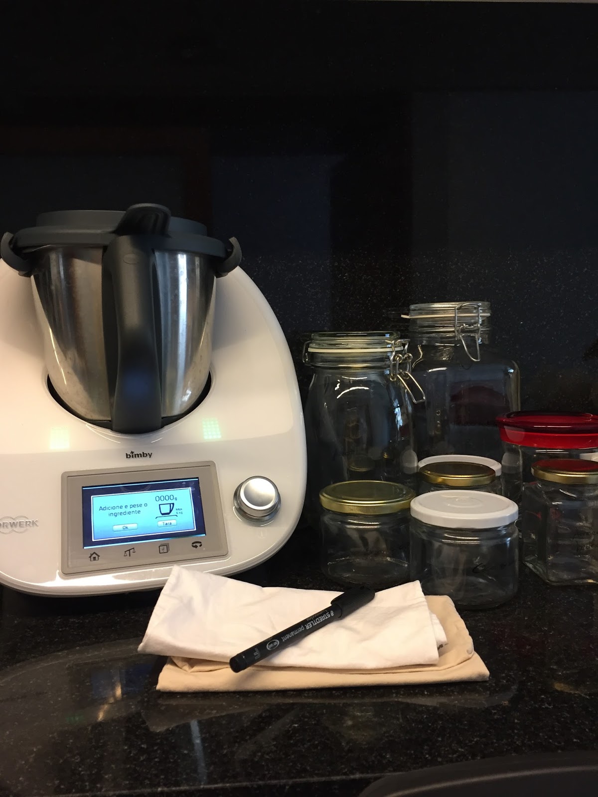 Liguei a bimby (para usar a balança) e pesei todos os frascos. A maior parte já tinha o peso (ou a tara) no fundo, mas com as lavagens acaba por ir saindo e já não se via muito bem. Podem fazer isto nas lojas, mas eu prefiro fazer em casa, assim não tenho que estar com essa preocupação na loja.